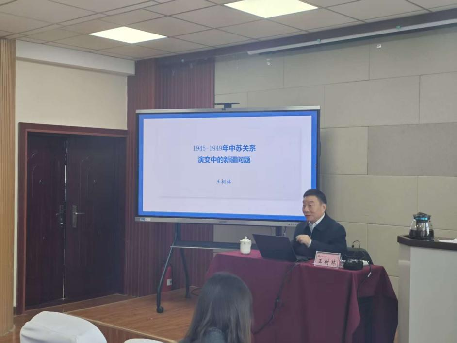 讲座围绕苏联对新疆传统政策的历史渊源、战后初期中苏关系演变过程中新疆问题的特殊性与复杂性、中国共产党在新疆问题上策略的转变、新疆和平解放过程中的关键节点与多方互动四方面展开。王教授指出,1945—1949年新疆问题的演变,不仅是中苏关系的重要组成部分,也是理解中国近代国家建构与边疆治理的关键视角。新疆的和平解放,是中国共产党在复杂国际环境下实现国家统一与边疆稳定的成功实践,为我国的民族区域自治制度提供了历史经验。